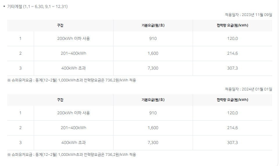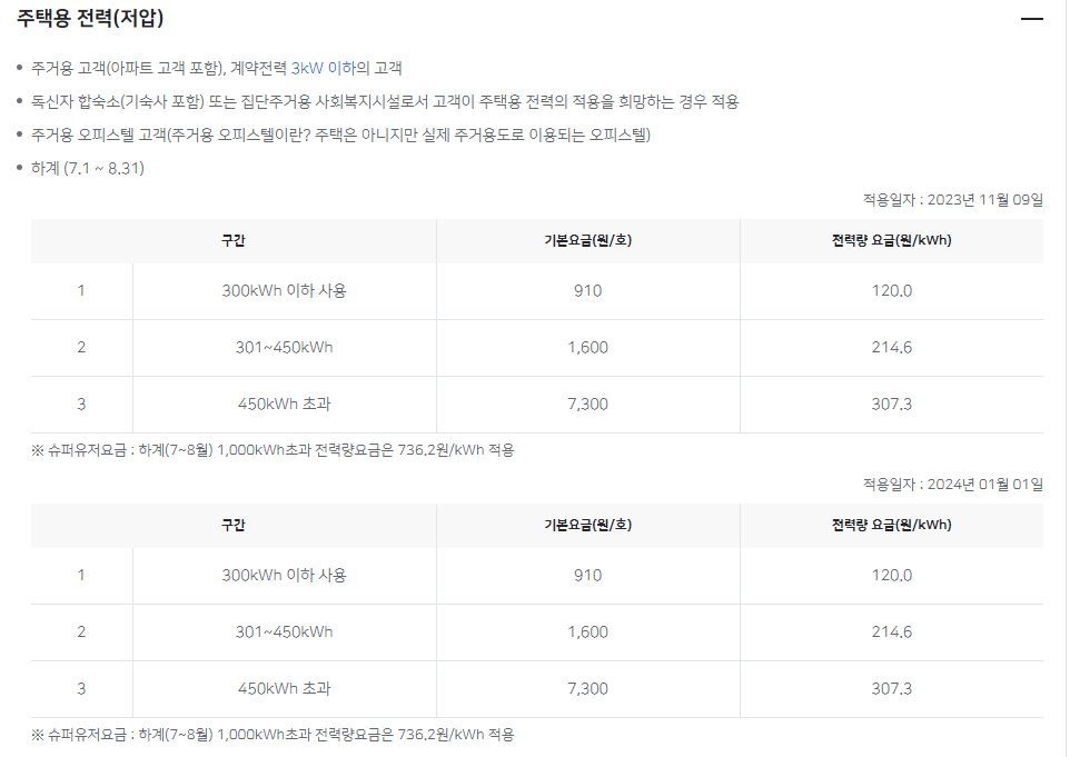 주택용(저압, 가정용) 전기 요금표