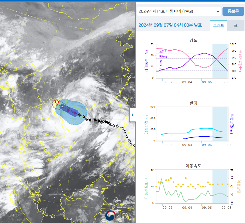 국립 기상예보센터에서 목요일 오전 10시 현재 야기는 중국 하이난 섬에서 북동쪽으로 약 490km 떨어진 남중국해 북부에 위치하고 있습니다.