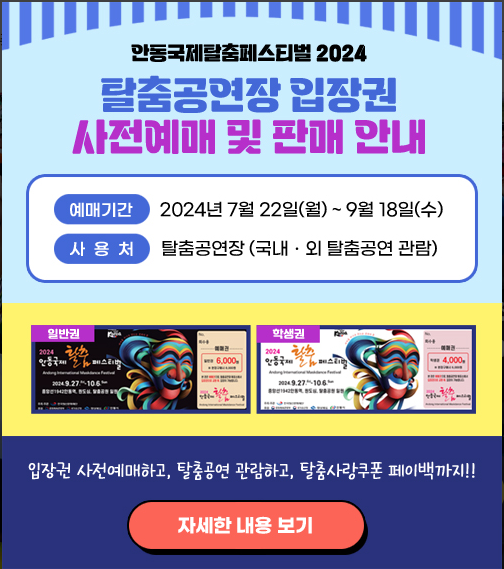 2024 안동국제탈춤페스티벌은 "세계를 하나로 만드는 문화의 춤"을 주제로 5대양 6대주 세계 각국의 탈과 탈춤을 만날 수 있는 특별한 여행의 장을 마련합니다.
