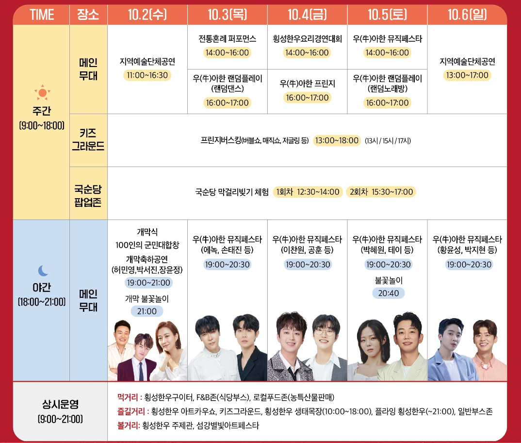 2024년 10월 2~6일까지 5일간 횡성 섬강 둔치 일원에서 펼쳐지는 이번축제는 "명품 횡성한우와 함께하는 가을 나들이"라는 주제로 방문객들을 맞이합니다.