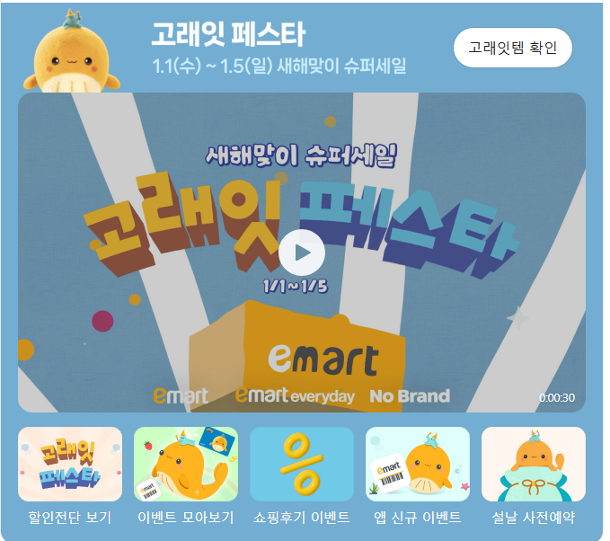 이마트 : '고래잇 페스타'진행, 초저가 상품 및 카테고리별 50%할인 제공