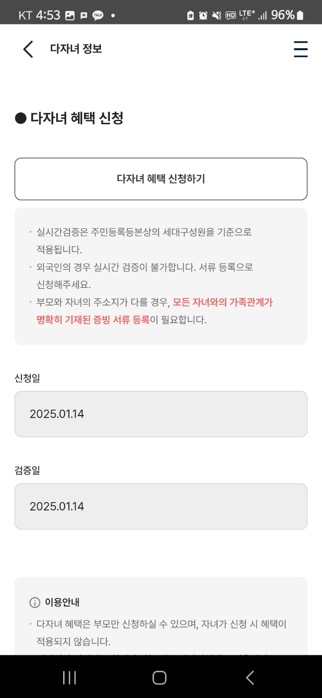다자녀 가구 혜택을 받기 위한 절차도 간소화되었습니다.